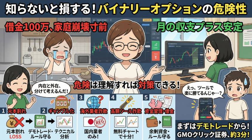 「バイナリーオプションって本当に危険なの?」そう検索しているあなたは、きっと慎重な人ね。それ、大正解よ。 だって私は、その慎重さがなかった人間だから。 FX・バイナリーオプション歴15年。40代の専業主婦トレーダー。でもその15年のうち最初の5年間...