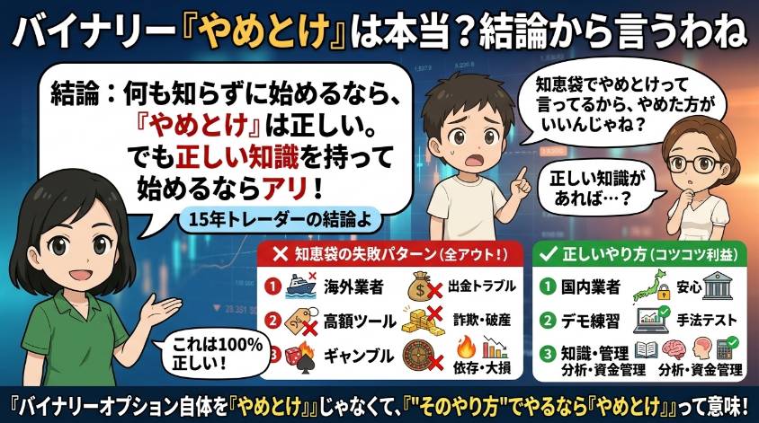 「バイナリーオプション やめとけ」知恵袋で検索したこと、あるでしょ? 「やめとけ」「詐欺」「大損した」「人生終わった」そんな回答がズラッと並んでいて、画面をスクロールするたびに胃がキュッと締まる感覚。わかるわ、その気持ち。 正直に言うわね。...