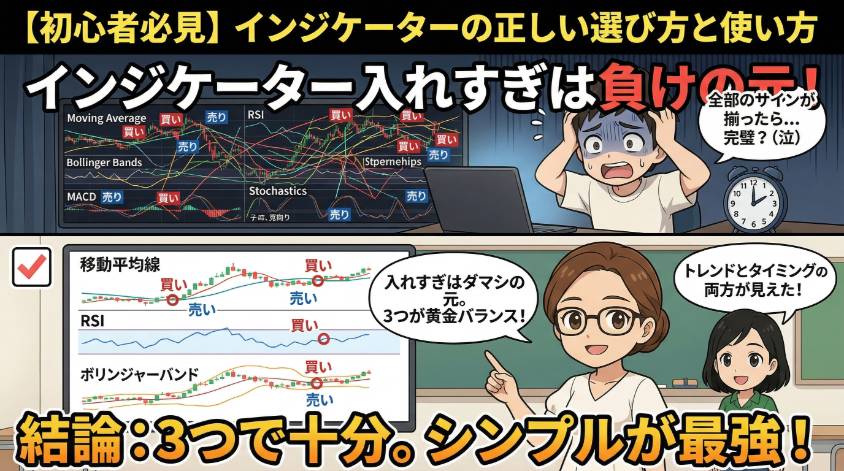 チャートにインジケーターを5個も6個も並べて、「全部のサインが揃ったら完璧なエントリーができるはず!」って意気込んだ夜があったわ。 結果?永遠にサインが揃わなかったの。 移動平均線は「買い」って言ってるのにRSIは「待て」、ボリンジャーバンドは...