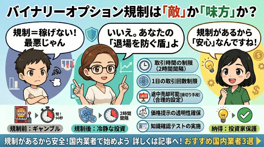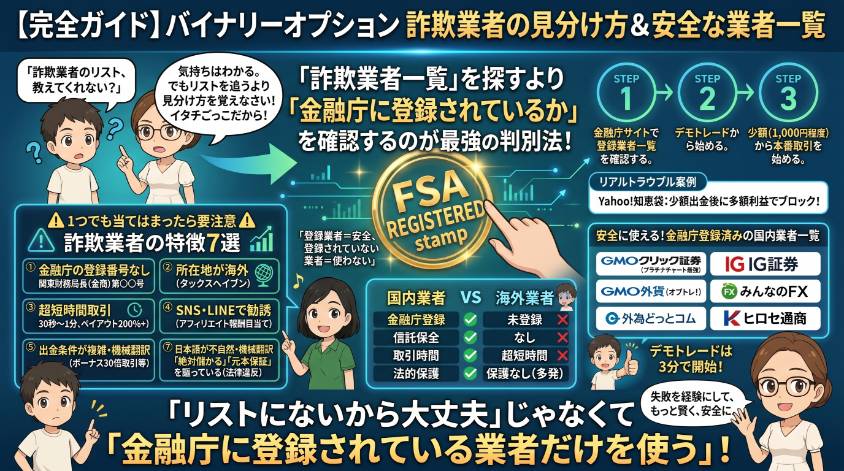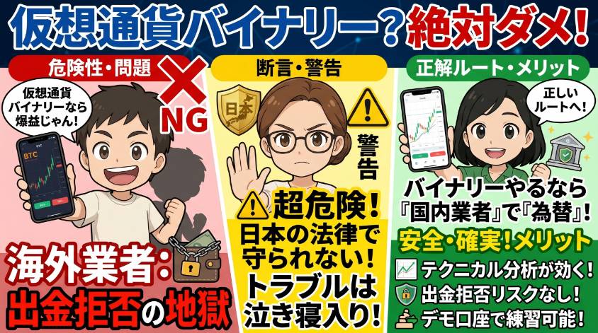 「バイナリーオプションって…違法なの?」 ある日、ママ友とランチしてた時のこと。「最近バイナリーオプションやってるんだよね」って何気なく話したら、ママ友が箸を止めて真顔になったの。 「えっ、それ違法じゃないの?ニュースで逮捕とか見たよ?」 ...