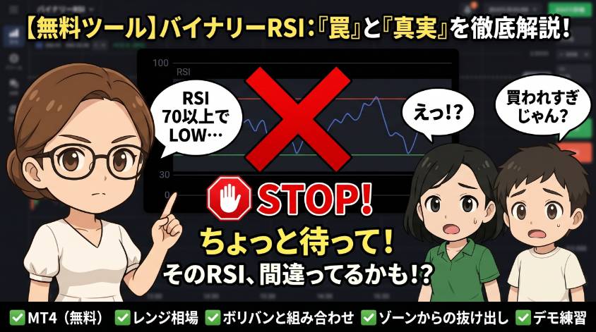 「RSIが70を超えたからLOWエントリーでしょ?」 もし今、あなたがそう思っているなら、ちょっとだけ待ってほしい。 実は私も、バイナリーオプションを始めて半年くらいの頃、まったく同じことを考えていたの。RSIが70を超えたら「買われすぎだから下がるは...