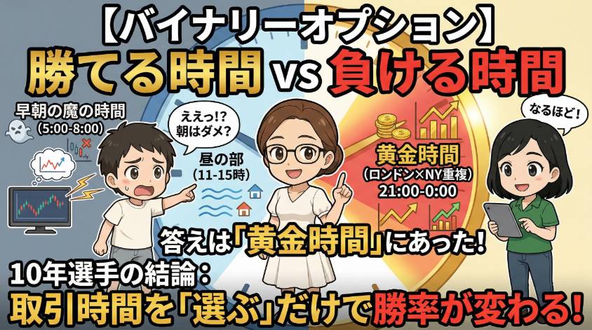 「バイナリーオプションって、いつ取引できるの?」 これ、私もバイナリーオプションを始めた頃にちゃんと調べなかったのよ。「FXみたいに24時間いつでもできるでしょ?」くらいの認識で、朝7時台からエントリーしてた。 結果? 早朝の閑散相場でチャート...