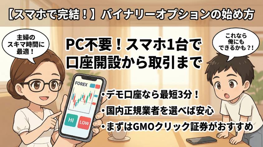 「バイナリーオプションって、スマホだけでもできるの?」 子どもを寝かしつけた後の、静かなリビング。テーブルの上にはスマホが1台。ふと思い立って検索バーに打ち込んだのが、まさにこの言葉だった。 私も最初はそうだったの。パソコンなんて持ってない...