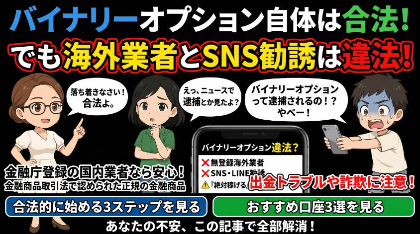 「バイナリーオプション、始めてみたいけど…国内の業者ってどれがいいの?」 そう思って検索してるあなた、めちゃくちゃ正しい判断をしてるわよ。 実は私、最初は海外の無登録業者に手を出しちゃったの。SNSで見かけた「短時間で高収益!」って広告に惹か...