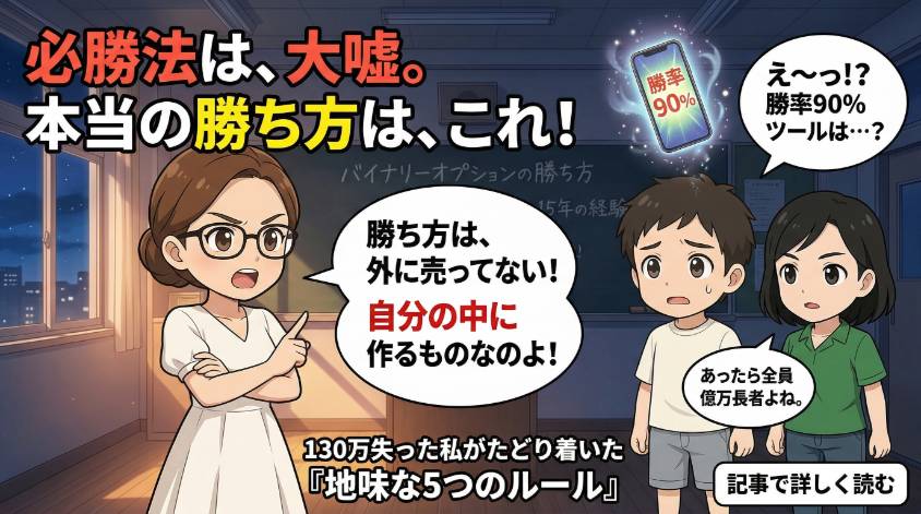 「バイナリーオプション、勝ち方さえわかれば…」 その気持ち、痛いほどわかる。私も15年前、全く同じことを思ってたから。 深夜のリビングで、スマホの画面に「バイナリーオプション 勝ち方」って打ち込んで、出てくる記事を片っ端から読んだ。「必勝法」...