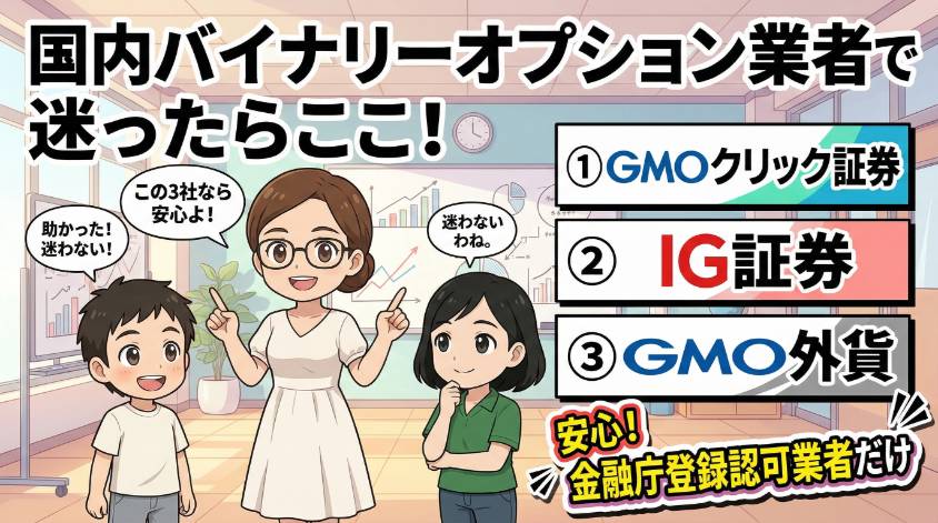 どの業者で始めるか迷っている人向けに、おすすめの国内バイナリーオプション業者をまとめたわ。全て金融庁に登録された国内認可業者だから安心してね。