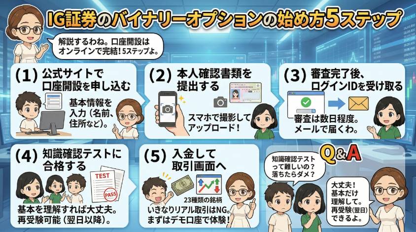 IG証券でバイナリーオプションを始めるまでの流れを5ステップで解説するわね。口座開設自体はオンラインで完結するから、そこまで面倒じゃないの。
