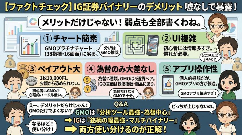 メリットだけ書いたら嘘になる。正直に、IG証券弱点も全部書くわね。