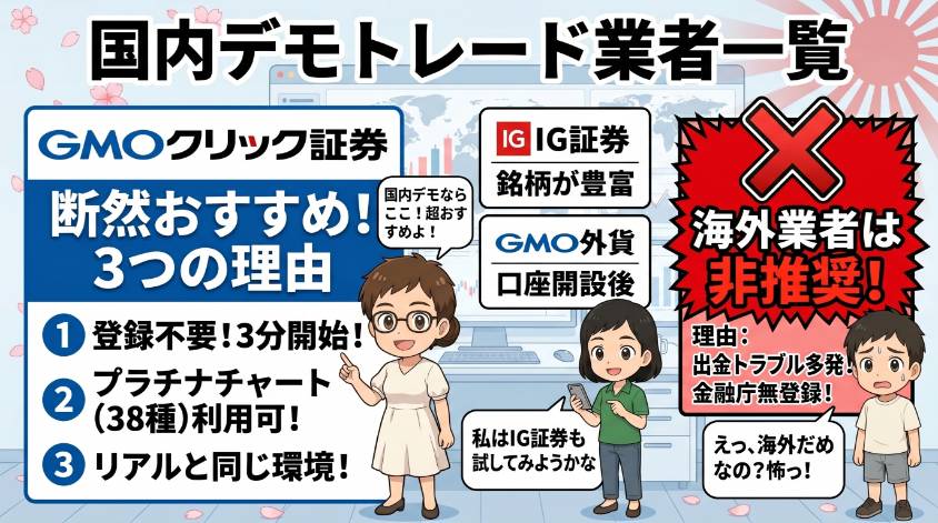 ちなみに、海外業者のデモは一切おすすめしないわ。海外業者は金融庁に登録していないものが多く、リアル口座で出金トラブルが多発してる。デモで練習して「この業者いいな」と思ってリアルに移行したら出金できない…なんてことになりかねないの。デモも国内業者で