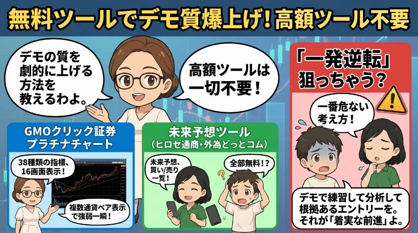 デモトレードの質を劇的に上げる方法がある。無料の分析ツールを組み合わせること。高額ツールは一切不要よ。