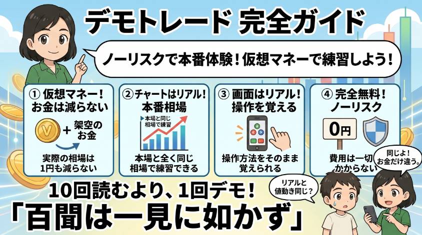同じよ。違うのは「お金が本物かどうか」だけ。だからデモで練習する意味があるの。リアルと同じ環境で、ノーリスクで経験を積めるんだから