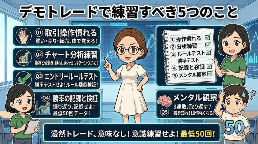 • デモで練習すべきは5つ:操作・チャート分析・ルールテスト・勝率記録・メンタル観察