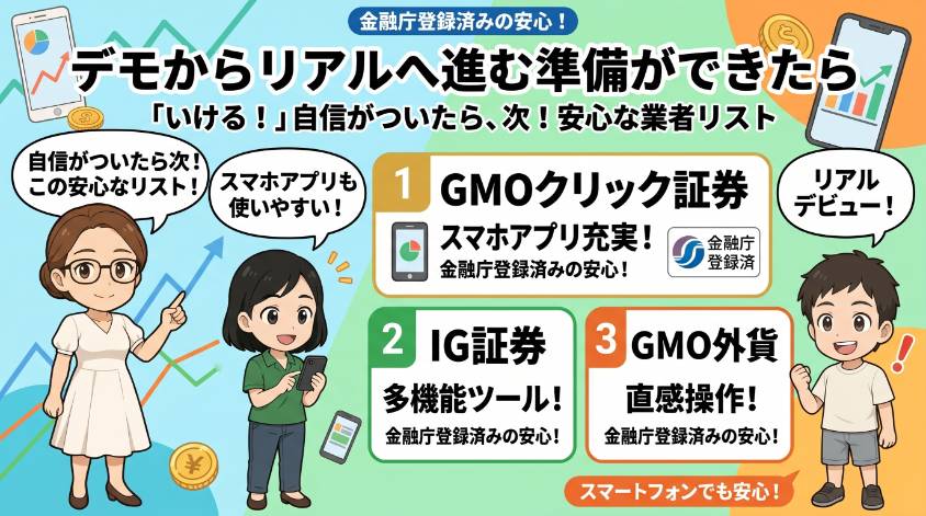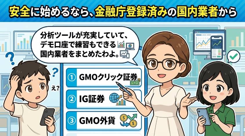 デモで練習して「いける!」と自信がついたら、次はリアル口座ね。分析ツールが充実していて、金融庁に登録されている安心な業者をまとめたわ。
