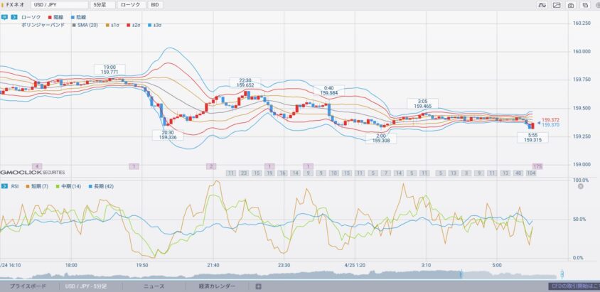 チャートに移動平均線・ボリンジャーバンド・RSIを表示して、実際の値動きと照らし合わせてみて。