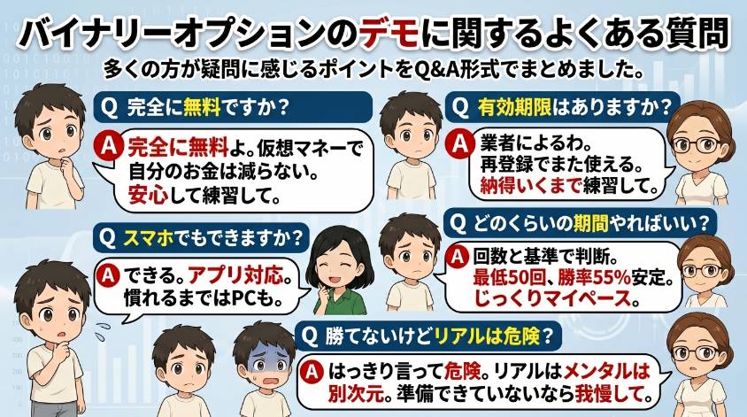 バイナリーオプションのデモについて多くの方が疑問に感じるポイントをQ&A形式でまとめました。