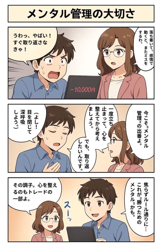 「2連敗したらその日は取引をやめる」など、あらかじめルールを決めておくことで感情の暴走を防げます。また、勝っているときも油断せず、ルールを守り続けることが大切です。深呼吸や休憩を挟むのも効果的です。