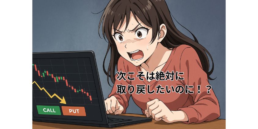連続で負けたあと「次こそは取り返したい」と焦って倍の金額でエントリーすると、損失がさらに大きくなるリスクがあります。