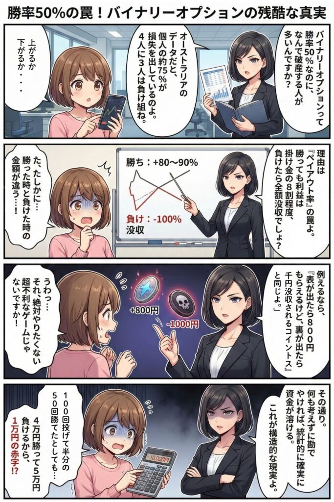 何も考えずにやり続ければ、統計的にほぼ確実に負ける。これがバイナリーオプションの構造的な現実よ。
