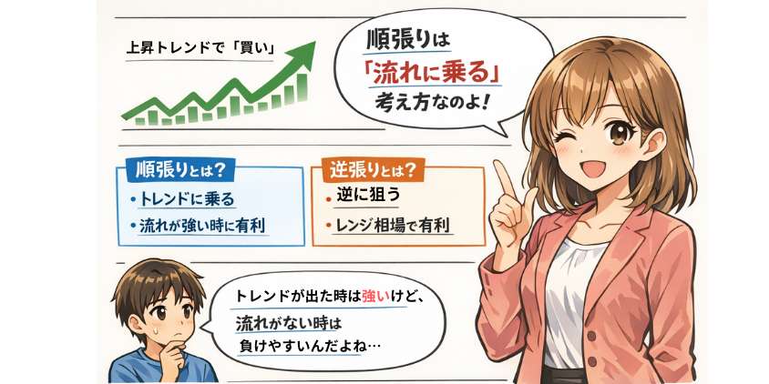 - 順張りは「相場の流れに乗る」手法で、トレンド相場で力を発揮