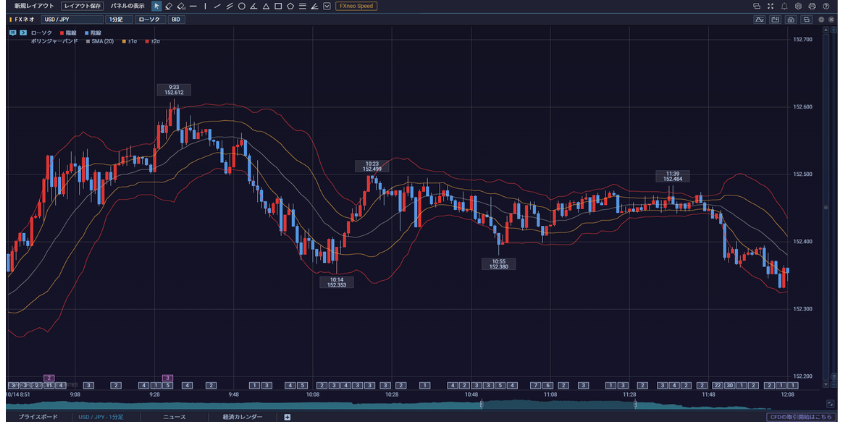 - 38種類のテクニカル指標や25種類の描画オブジェクトによって詳細な相場分析が可能