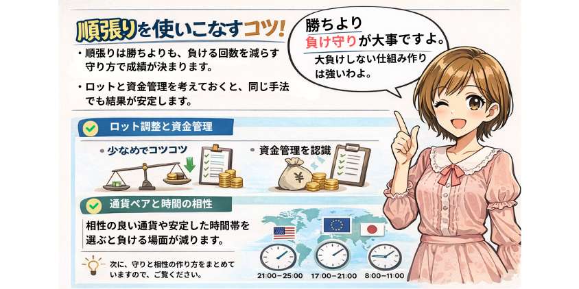 順張りは「負けを減らす守り」が重要です。資金管理を徹底し、1回の損失を一定に抑えることで、安定した結果につながります。また、流れが出やすい時間帯や通貨を選び、同じ条件で検証を続けることが上達の近道です。