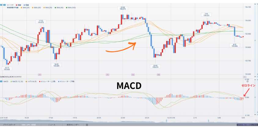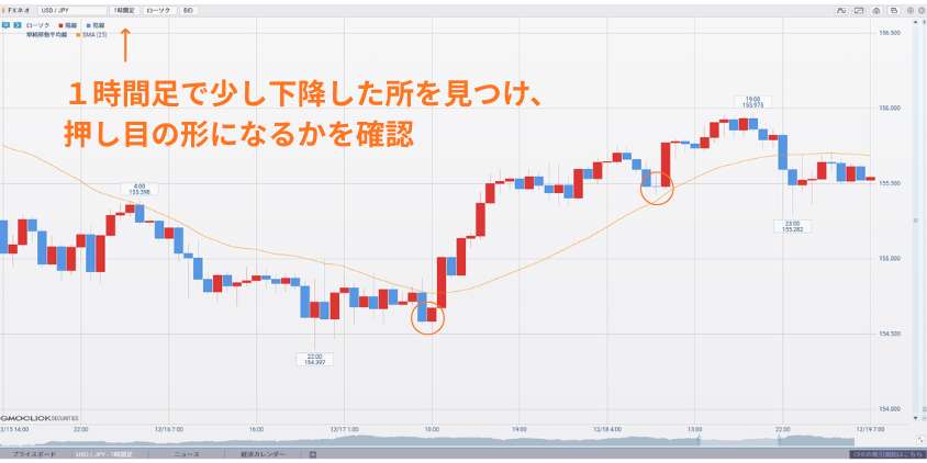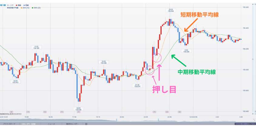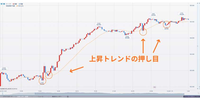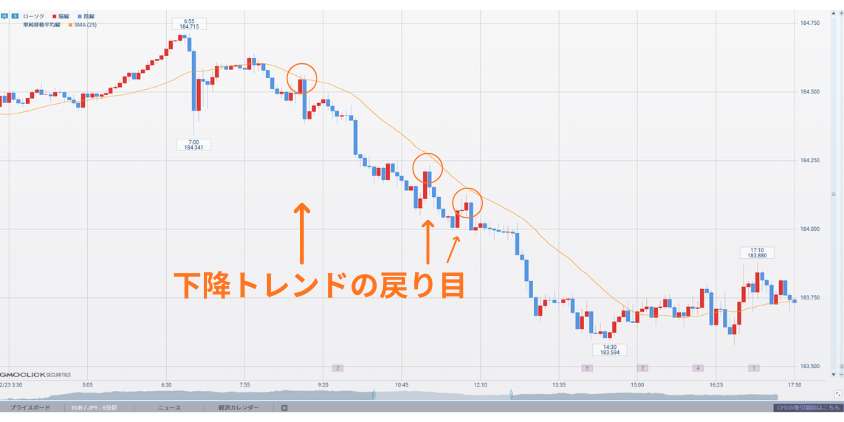 5分足で下げて移動平均線付近まで来たら、そこで止まるかを見ます。