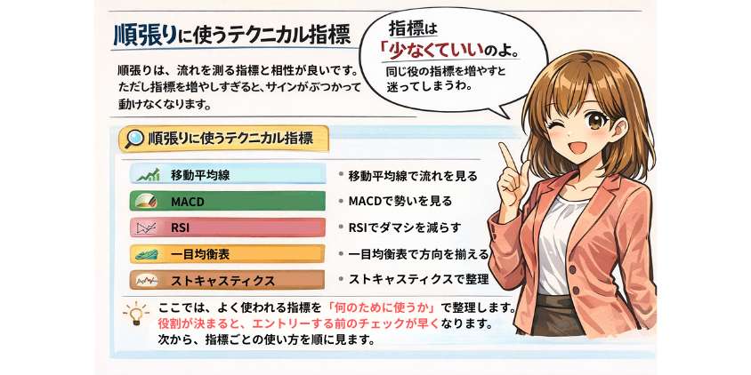 順張りでは、移動平均線で方向を確認し、MACDで勢い、RSIで押し目の深さを見るのが効果的です。一目均衡表やストキャスティクスも、補助的に使うと判断がしやすくなります。