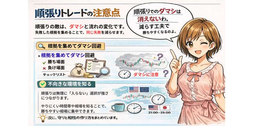 順張りでは「ダマシ」や「急な流れの変化」が注意点です。入る前に方向・場所・タイミングの3つの根拠を確認することで、ダマシを減らせます。また、横ばい相場や経済指標の発表前後は見送る判断も大切です。