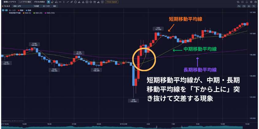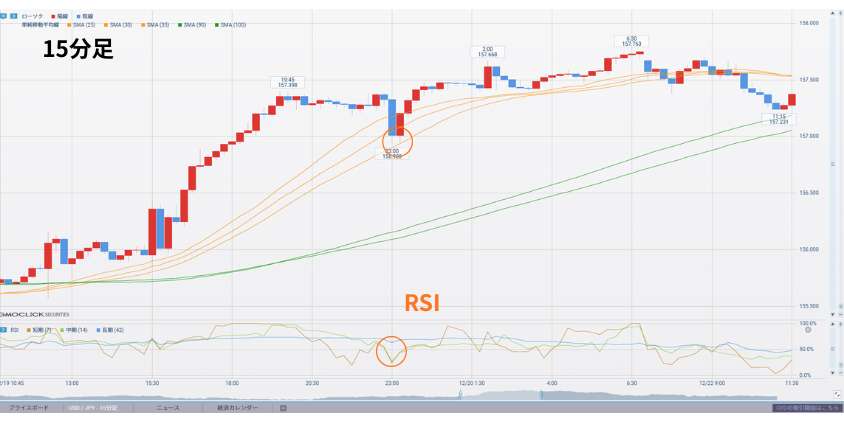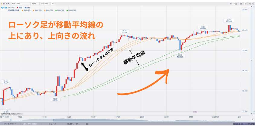 15分足で移動平均線が上向きなら、5分足では買いの形だけを待つと決めます。
