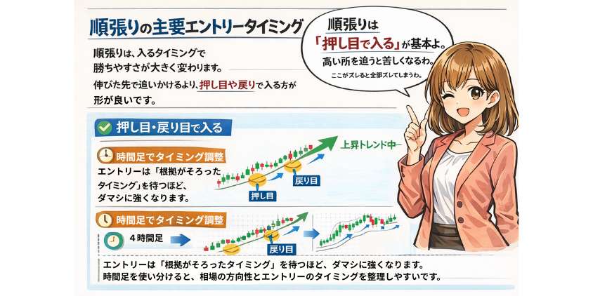 順張りでは「押し目買い」や「戻り売り」で入るのが基本です。時間足を使い分け、大きな足でトレンド方向を確認し、小さな足でタイミングを見て入ると、ダマシに遭いにくくなります。