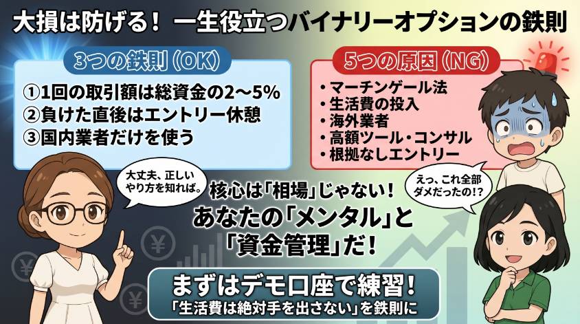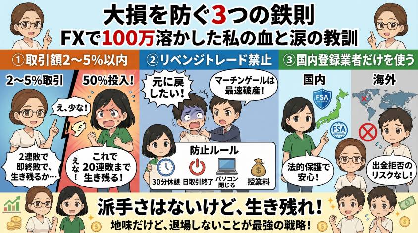 - 大損を防ぐ3つの鉄則:①1回の取引額は総資金の2〜5%②負けた直後にエントリーしない③国内の金融庁登録業者だけを使う