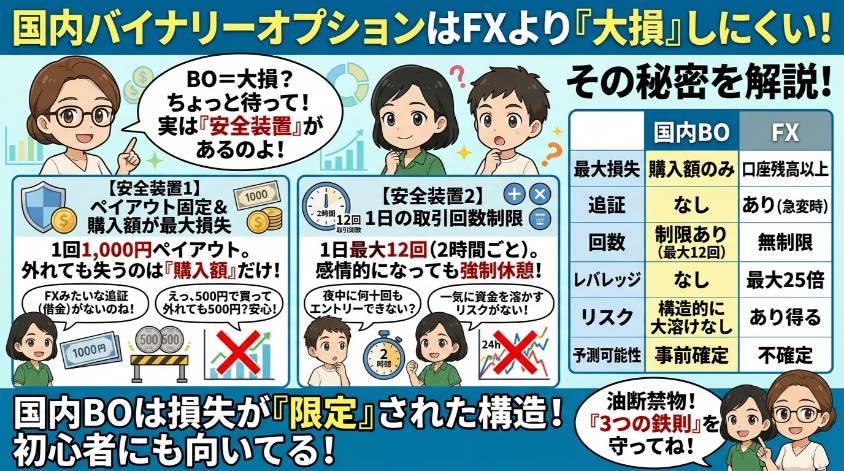 国内バイナリーオプションは、ペイアウト固定1,000円・購入額が最大損失・1日の取引回数制限という構造上、FXのように「一晩で数百万溶ける」ことは起きにくいの。これは後で詳しく解説するね。