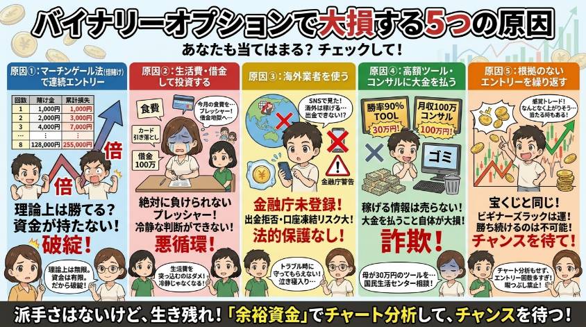 - 大損する5つの原因:マーチンゲール法、生活費の投入、海外業者、高額ツール・コンサル、根拠なしエントリー