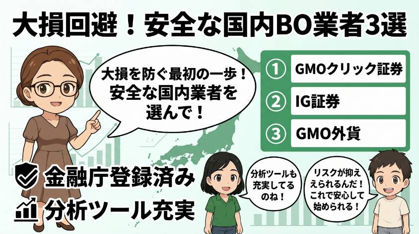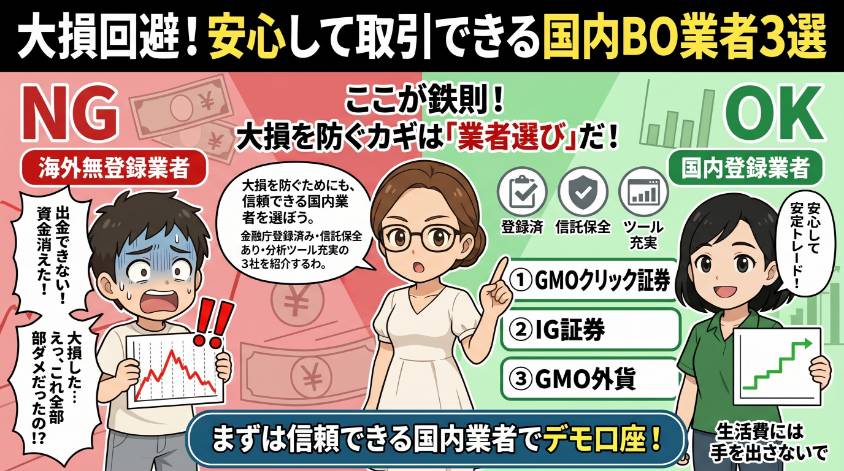 金融庁登録の国内業者なら、ペイアウト固定・取引回数制限・信託保全という安全装置があるため、構造的に大損しにくい。具体的にはGMOクリック証券、IG証券、GMO外貨などが代表的。ただし業者が安全でも、資金管理ができていなければ損失は出る。「業者選び+資金管理+メンタル管理」の3点セットが重要よ。