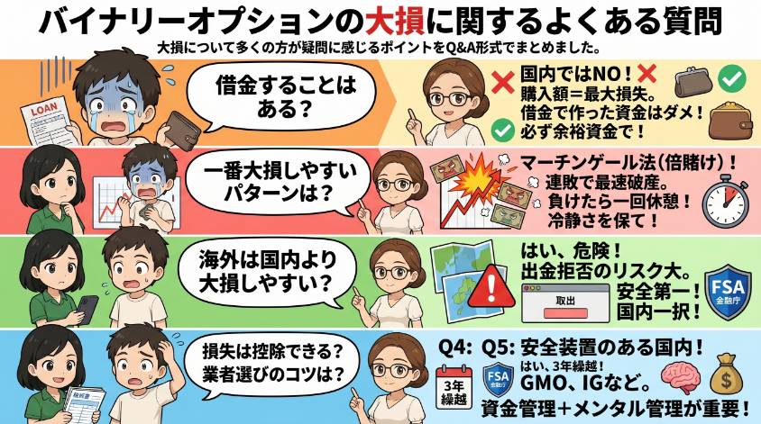 バイナリーオプションの大損について多くの方が疑問に感じるポイントをQ&A形式でまとめました。