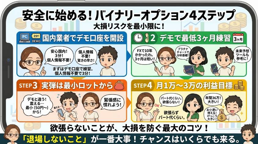 「じゃあ具体的にどうすればいいの?」ここからは実践編。大損リスクを最小限にしながら始める方法を、4ステップで解説するね。