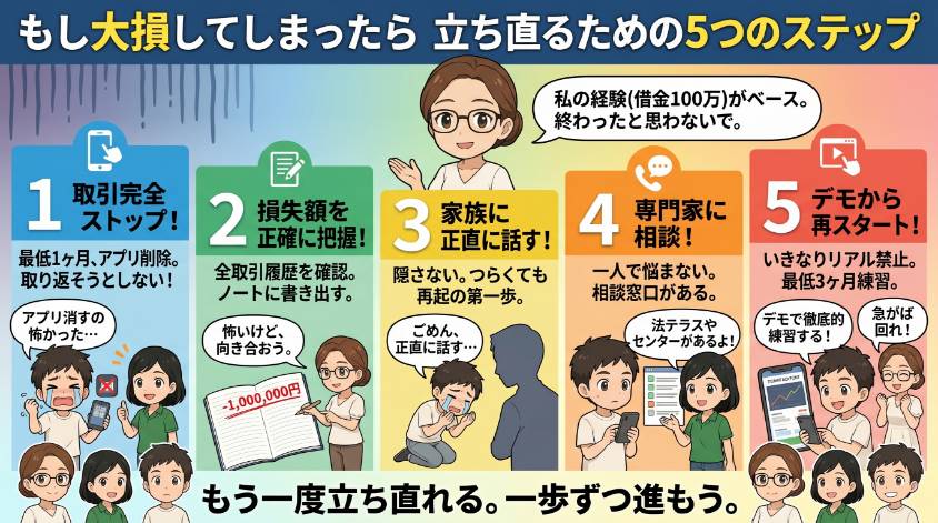 ここまで読んでくれたあなたは大損しないはず。でも万が一のために、大損してしまった時の対処法も書いておくね。私自身が借金100万から立ち直った経験をベースに話すから、どうか「もう終わりだ」なんて思わないで。