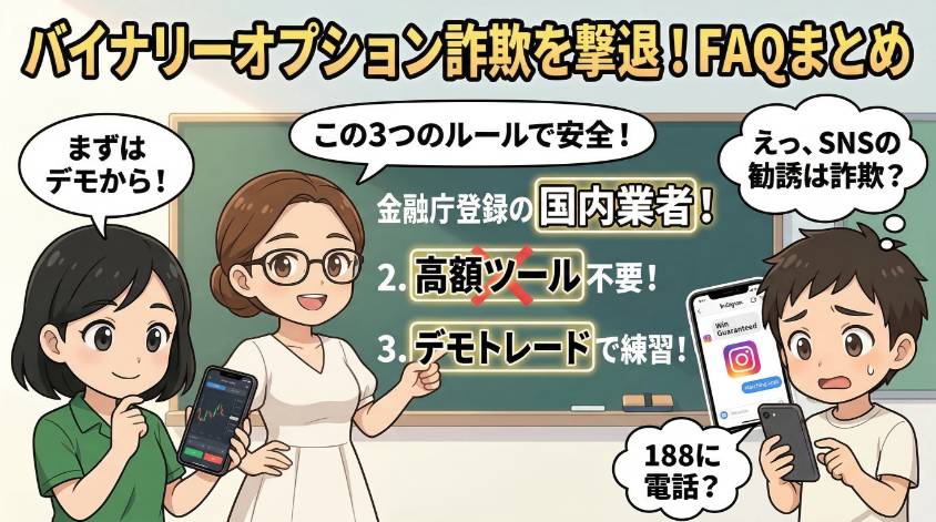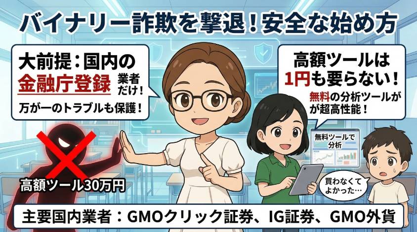 3つのルールを守れば安全に始められるわ。①金融庁登録の国内業者だけを使う(GMOクリック証券・IG証券・GMO外貨など)。②高額ツール・情報商材には1円も払わない。③まずはデモトレードで練習してから本番に挑む。この3つを守れば、詐欺に遭うリスクはゼロよ。