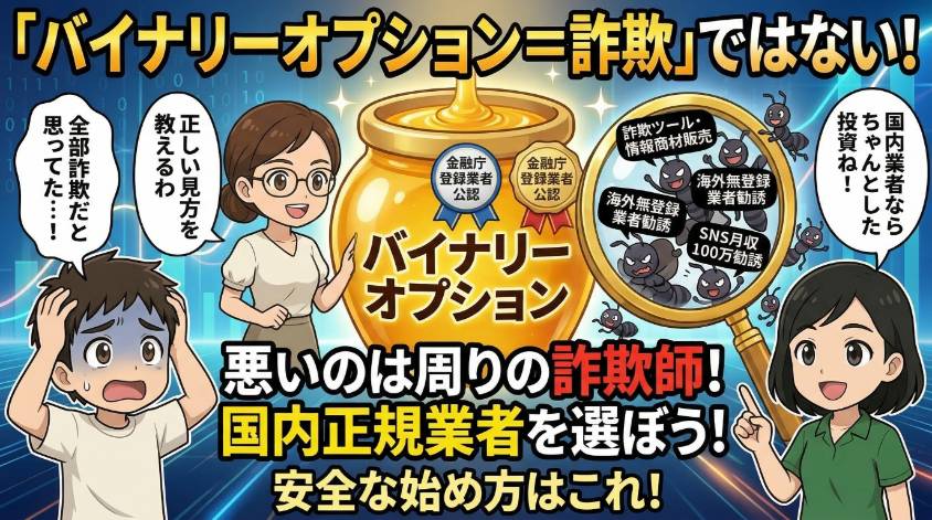 先に言っておくね。バイナリーオプション自体は詐欺じゃないの。金融庁に登録された国内業者が提供している正規の金融商品よ。問題は、「バイナリーオプション」を餌にして人からお金を騙し取る詐欺師がいること。この区別、めちゃくちゃ大事だから覚えておいて。