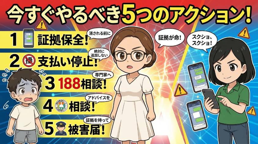 | 5 | 「限定○名」「今日中に決めて」 | 冷静な判断をさせないための圧力。焦らせるのは詐欺の常套手段 |