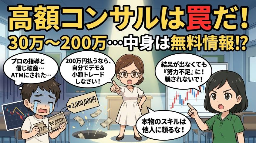 断言するけど、コンサルに200万円払うお金があるなら、そのお金でデモトレードと少額リアルトレードを自分で繰り返した方が100倍マシ。本物の投資スキルは、他人から買うものじゃなく、自分で身につけるものよ。