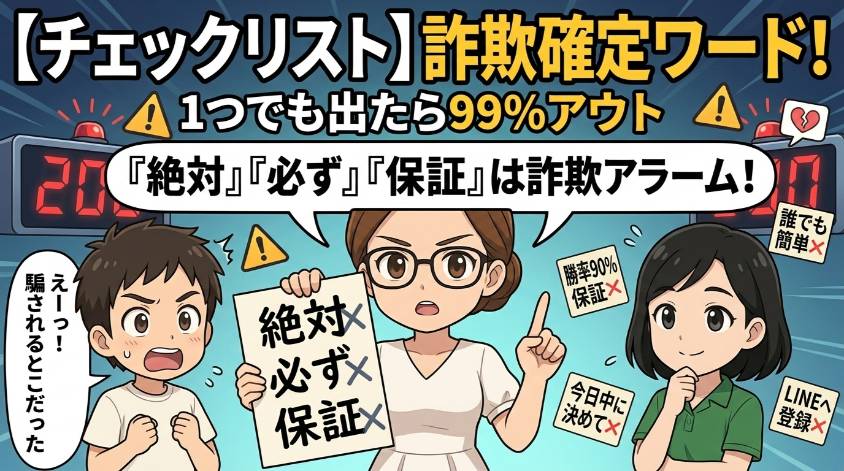 - 「必ず勝てる」「勝率90%保証」「元本保証」は詐欺確定ワード。この言葉が出たら即離脱