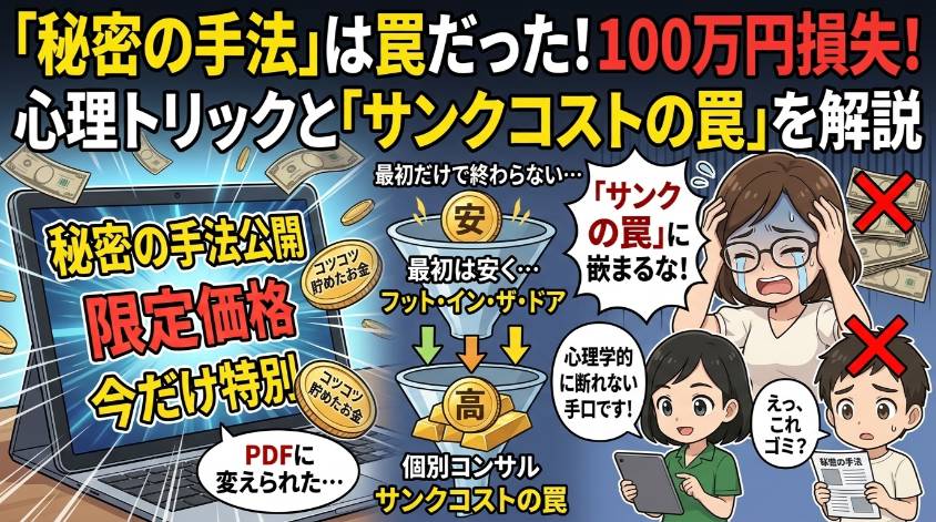 しかもタチが悪いのは、購入後に「上位プランのご案内」「個別コンサルで本気の指導を」とアップセルされるの。最初の商材で「これだけじゃ勝てない」と思わせて、さらに高額な商品を買わせる。これ、マルチ商法と同じ構造よ。