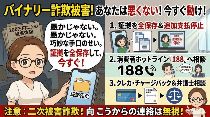 まず追加入金は絶対にしないで。「もう少し入金すれば出金できる」は嘘。次に証拠を保全して、消費者ホットライン(188)と警察のサイバー犯罪相談窓口に相談して。海外業者は日本の法律が及びにくいため返金は難しいケースもあるけど、泣き寝入りはしないで。金融庁にも情報提供してね。