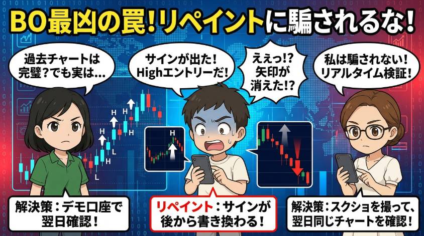 デモ口座でサインツールをリアルタイム稼働させて、サインが出た瞬間にスクリーンショットを撮っておく。翌日、同じチャートを開いて矢印の位置が変わっていないか確認する。位置が変わっていたら、そのツールはリペイントしている。