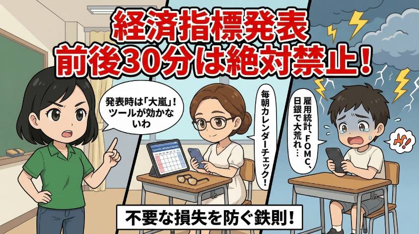 経済指標カレンダー(各FX会社のサイトや「みんかぶ」などで無料で見られるわ)を毎朝チェックして、その日の要注意時間帯を把握しておく。これだけで不要な損失を防げるの。