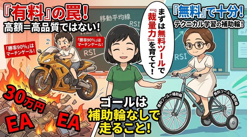 まず無料ツールで補助輪をつけて走り方を覚える。サインが出るたびに「なぜここでサインが出たんだろう?」と考える癖をつける。その積み重ねが、いつか補助輪を外しても走れる裁量力になるの。
