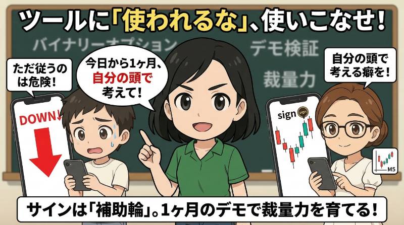 サインツールは、バイナリーオプションを初めての方がエントリーの感覚を養うための優れた「出発点」。でも、それは「ゴール」じゃない。