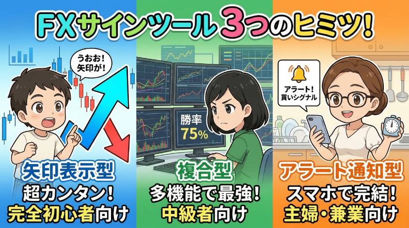 初心者にまずおすすめなのは、矢印表示型よ。チャートを見た瞬間に「あ、ここにサインが出てる」とわかるから、相場の動きとサインの関係を感覚的に掴みやすいの。