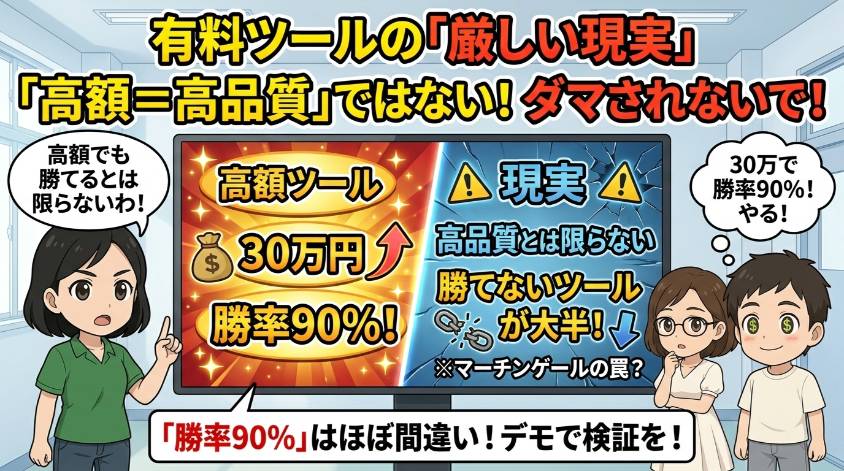 特に注意してほしいのが、勝率90%以上を謳っているツール。これはほぼ確実にマーチンゲール法(負けたら倍額を賭け続ける手法)が前提になっているか、バックテストを過剰に最適化した数字よ。実際のリアルトレードでその勝率が出ることは、まずないわ。